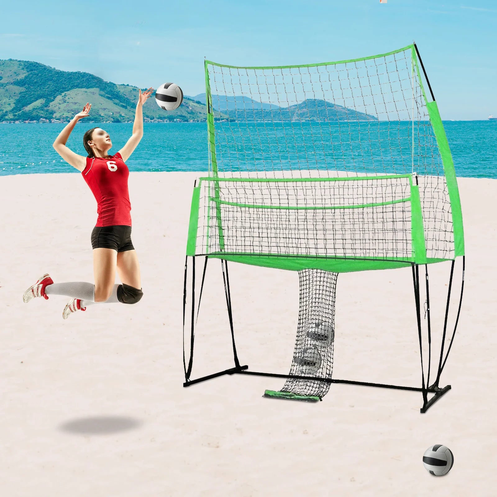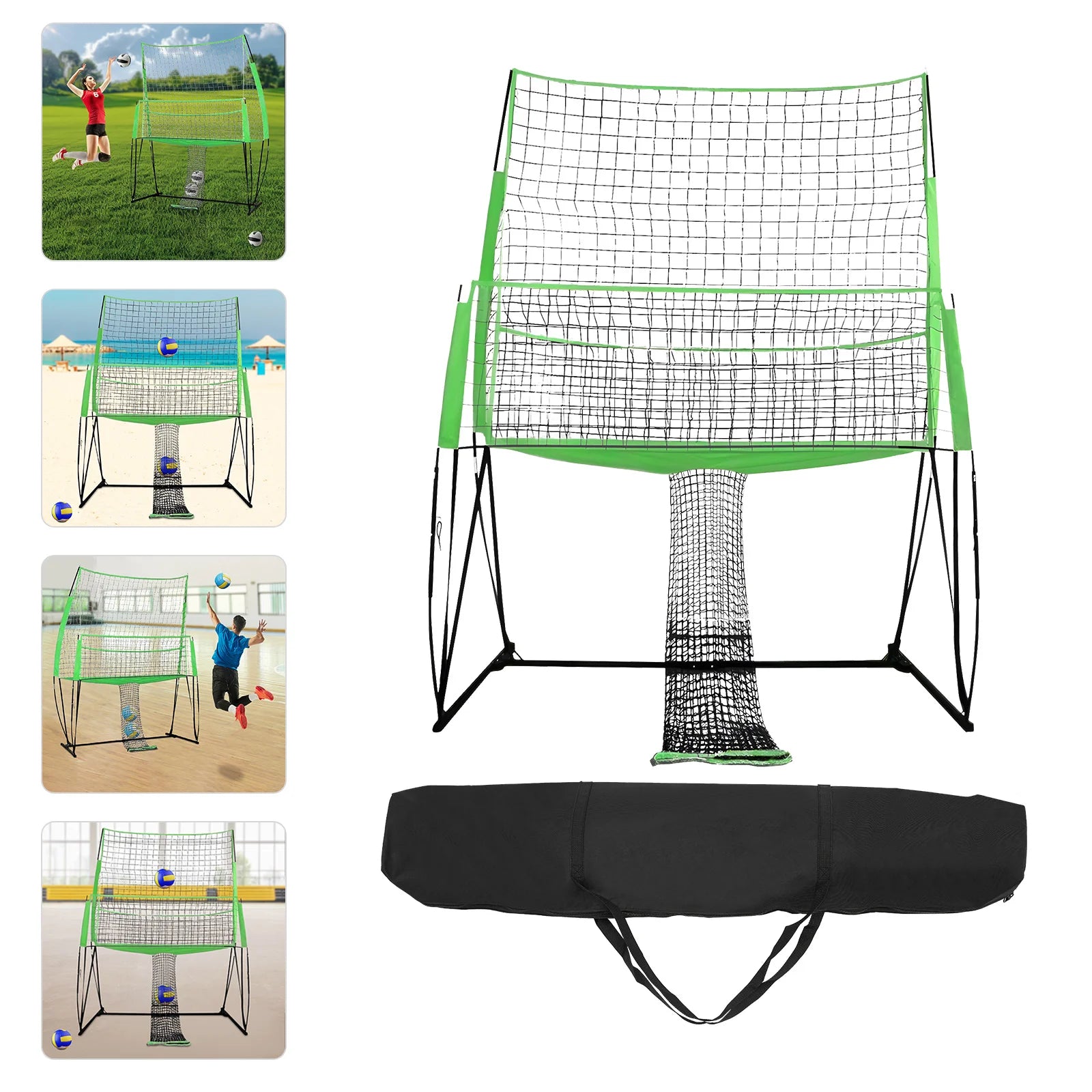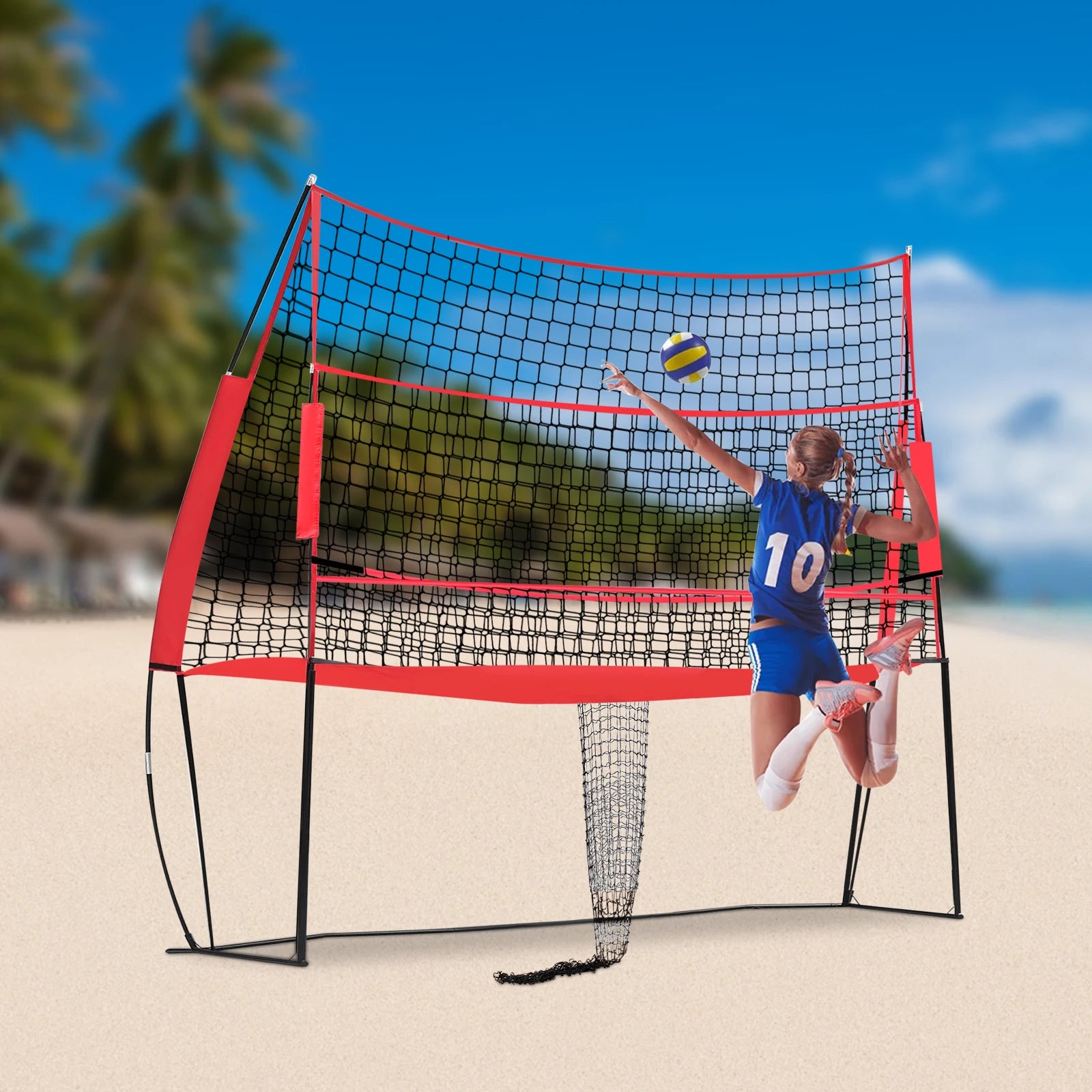 This volleyball training net measures 2.44 by 3.35 meters and features an adjustable front net height of 1.98m to 2.4m (6.5ft to 8ft), suitable for users of all ages. Constructed from durable nylon and iron with double stitching and baking paint, it offers excellent resistance to corrosion, rust, and wear for long-lasting use. Designed for versatility, it supports volleyball, badminton, and tennis training. The removable back net and ball collection hole simplify retrieval, while the simple assembly requires no tools. Included carrying bag makes transport and storage convenient for home, gym, or outdoor practice.