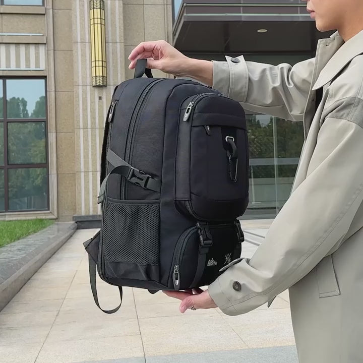 This large travel backpack by Wind Eagle offers a capacity of 56-75 liters and is designed specifically for men. Made from durable polyester with a softback design, it features an arcuate shoulder strap system and a soft handle for comfortable carrying. The backpack includes multiple interior compartments such as slots for phones, keys, and a computer interlayer, along with a separate shoe pocket. Its solid exterior with zipper closure provides secure storage, making it suitable for both business and outdoor sports activities. Slight measurement variations of 1-3 cm may occur due to manual crafting.