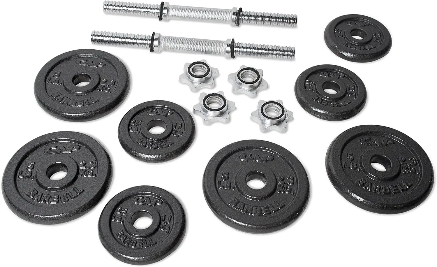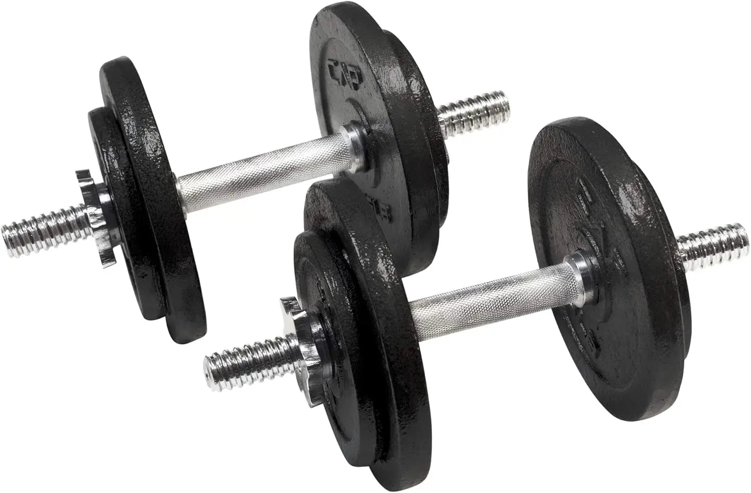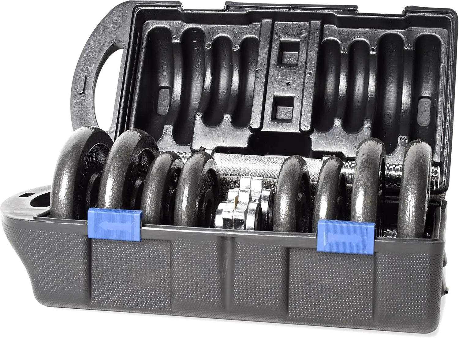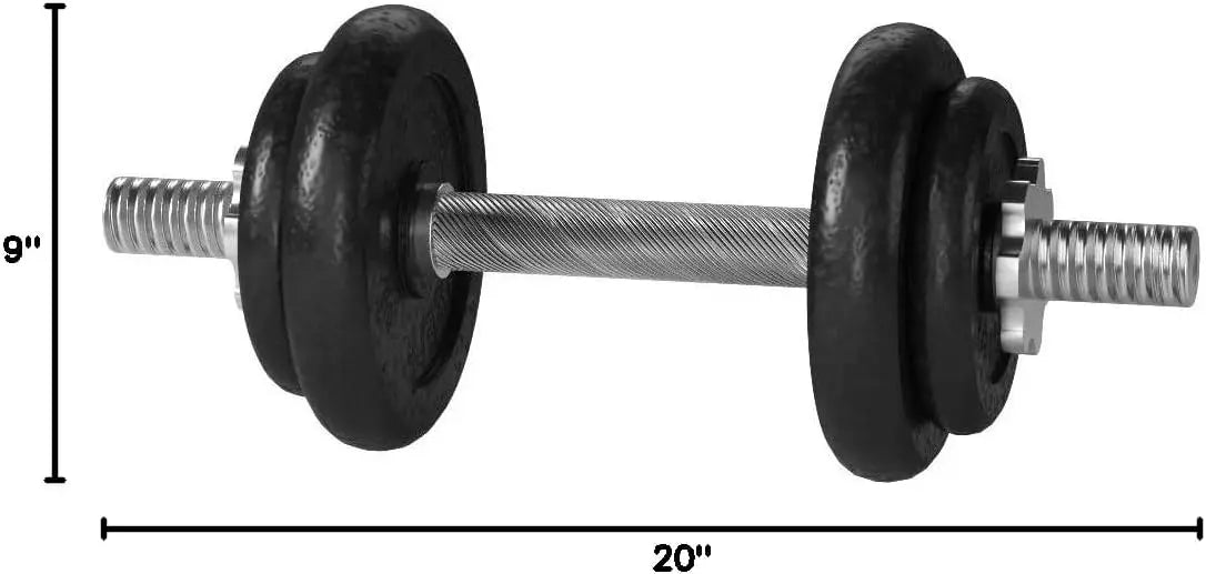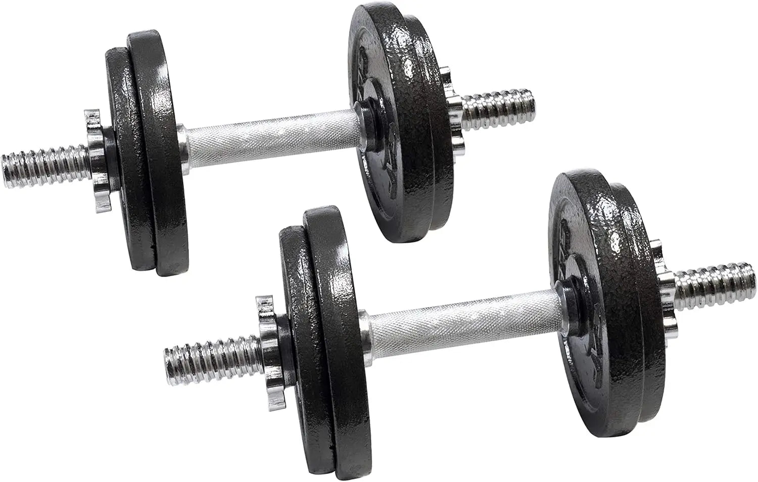 This 40-pound dumbbell set includes two solid steel handles, four 2.5-pound plates, four 5-pound plates, four threaded collars with rubber trim for a secure grip, and a plastic storage case. The durable cast iron plates feature a semi-gloss finish that resists rust and requires minimal maintenance. Ergonomically designed grips ensure comfort during use. Ideal for targeting specific muscle groups or full-body strength training, these dumbbells are suitable for isolation exercises, functional training, and HIIT workouts. Supported by over 30 years of fitness industry expertise, this set delivers trusted quality and performance.