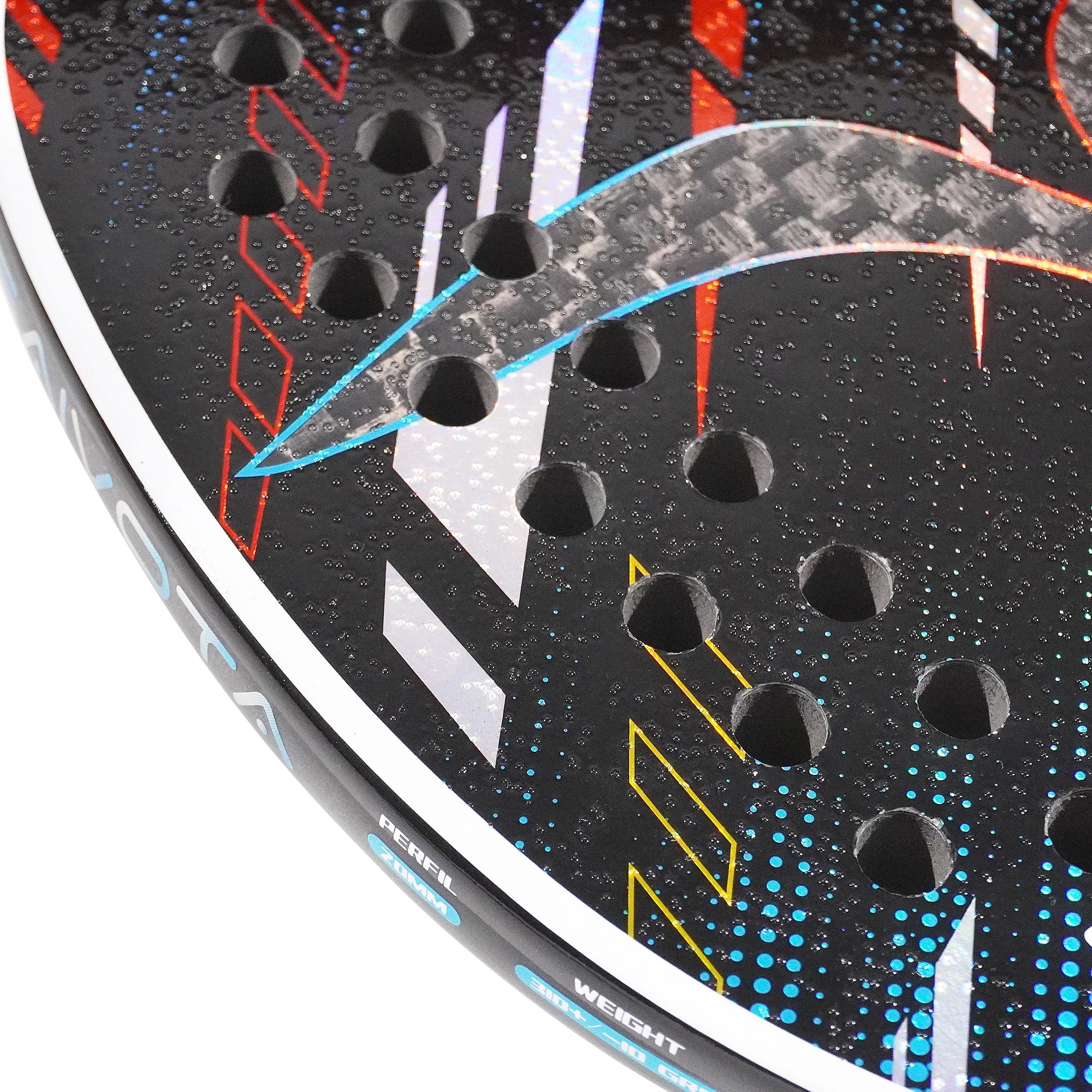 The GAIVOTA 5.6 beach tennis racket is engineered for advanced and professional players, featuring a 12K carbon fiber frame and a rough, factory-treated surface for enhanced control. It sports a 23 cm face size, weighs approximately 310 grams, and has a light tip balance point for improved maneuverability. The rigid grip measures 4 3/8, and its core includes 38 plus 3 holes to optimize performance. With high-quality EVA providing excellent elasticity and durability, this oval-shaped racket (central sweet spot) measures 50 cm in length and 20 mm in thickness. A 30-day warranty covers manufacturing defects.