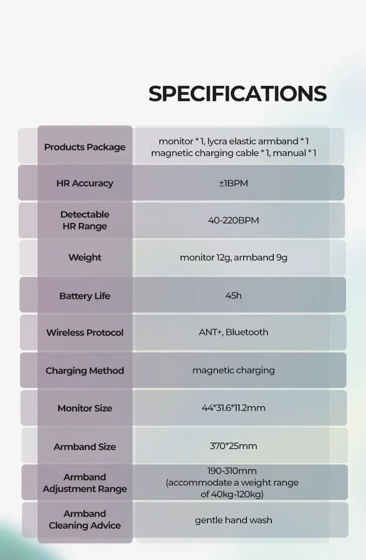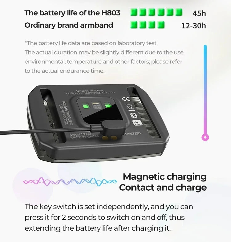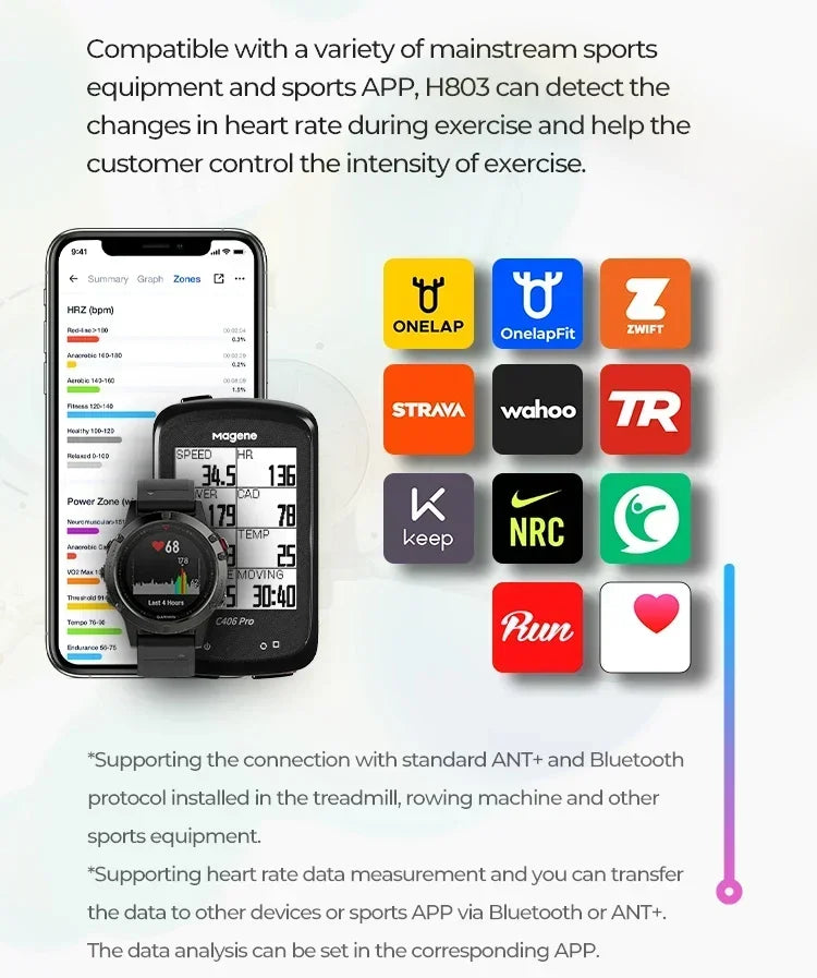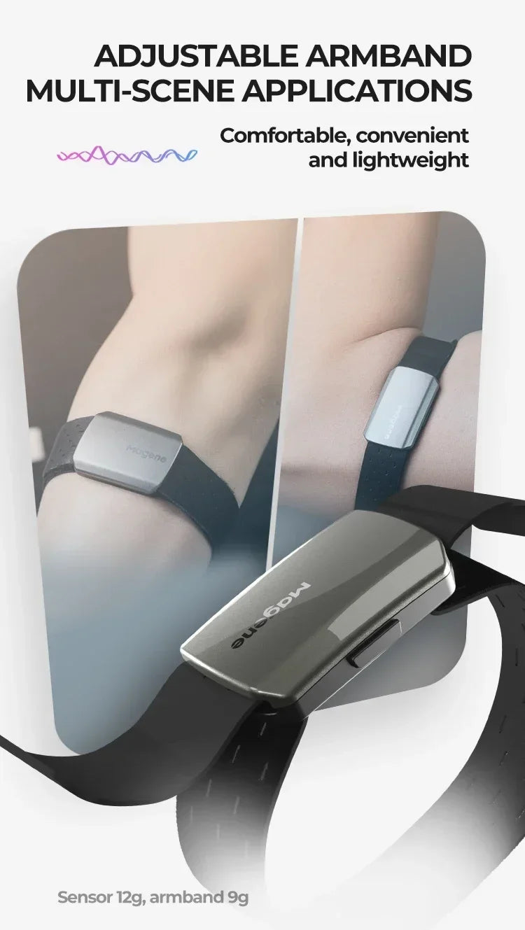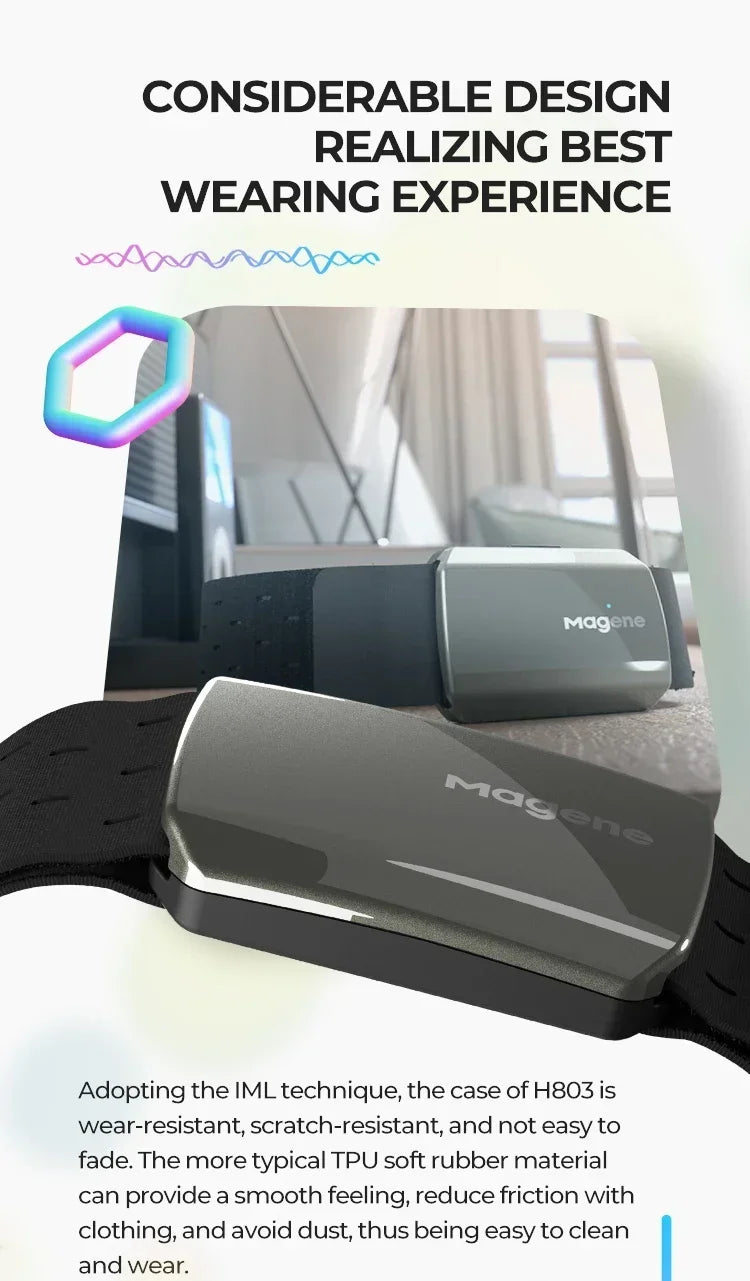 The Magene H803 Heart Rate Monitor is a precise armband sensor designed to track your heartbeat and motion with advanced dual-mode Bluetooth and ANT connectivity. Engineered without any high-concern chemicals, this model (H803) ensures safety alongside performance. Its reliable sensor technology supports accurate monitoring during various activities, providing valuable data to optimize your fitness and health routines. Ideal for athletes and fitness enthusiasts seeking dependable wearable monitoring devices.