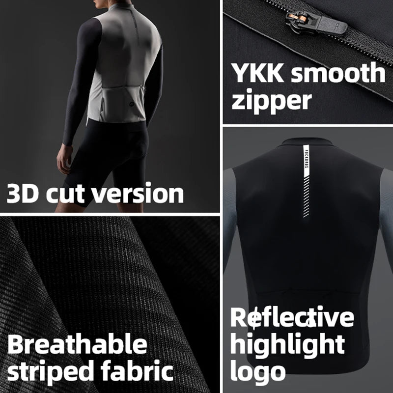 SPECIFICATIONS Brand Name: ROCKBROS Closure Type: Zipper Weaving Technique: Other Features: Breathable, Quick Dry, Reflective, Anti-sweat, Pockets Fit: Smaller Than Usual Gender: Men Chemical Concerns: None Item Type: Jerseys Material: Polyester, Spandex Season: Spring, Summer, Autumn Sleeve Length: Full Sport Type: Cycling Zipper Length: Full Is Customized Zipper: No Full Opening: Yes Product Information Brand: ROCKBROS Weight: Approximately 145g Fabric Composition: 68% polyester, 32% spandex Fit Style: Tight Properties: Breathable, moisture-wicking, sweat-absorbent Product Features 1. Hem with adhesive for effective anti-slip performance 2. Rear pocket for convenient storage 3. Seamless sleeve edges for enhanced comfort 4. Smooth YKK zipper closure 5. Reflective details to improve visibility and safety during night rides