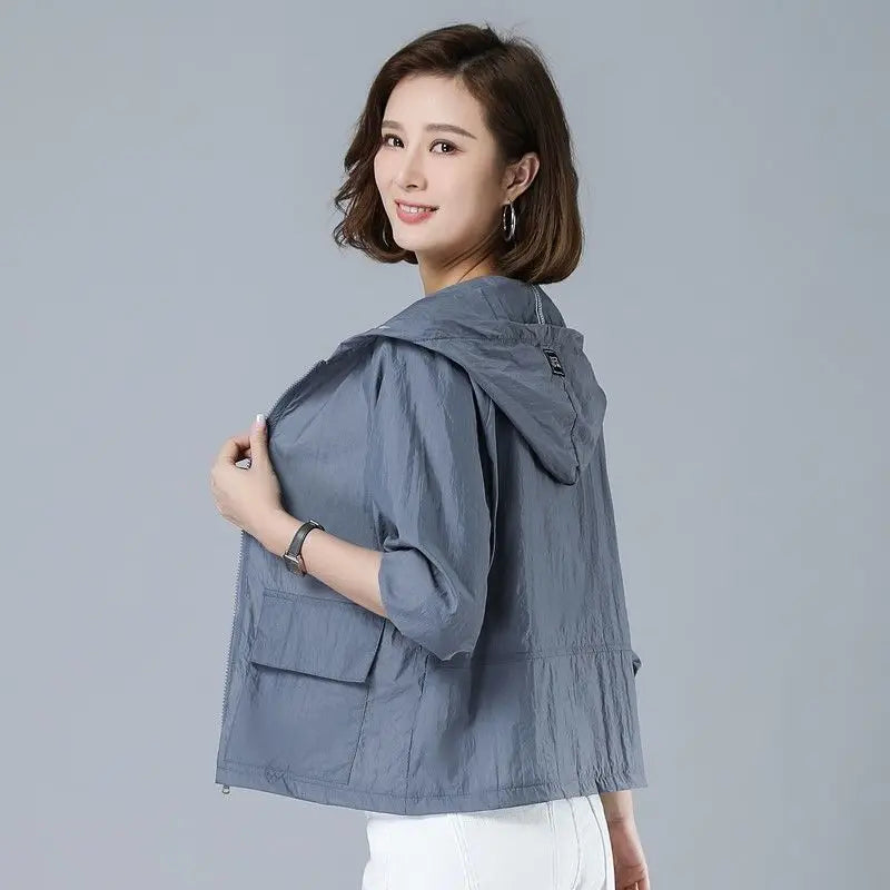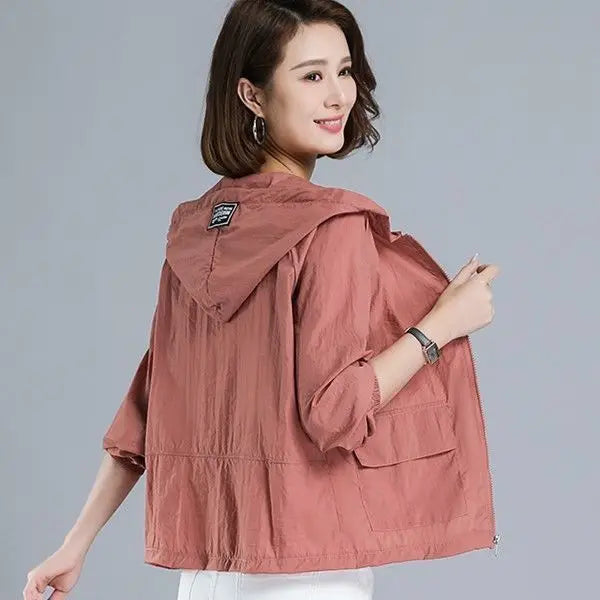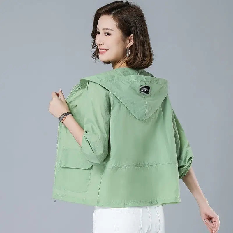 This women's outerwear jacket is crafted from a durable blend of nylon and polyester, featuring a regular length and full sleeves for versatile coverage. Designed with a casual, loose fit, it includes a hood and a zipper closure for convenience and adaptability. Embellished with floral embroidery and spliced details, this lightweight knit jacket combines practical functionality with refined style, ideal for spring and summer seasons.