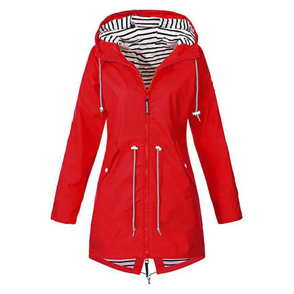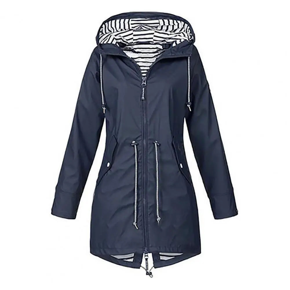 This women's jacket features a solid color design with a zipper closure, knee-length cut, and slim waist for a sleek and fashionable look. Crafted from high-quality polyester, it is lightweight, soft, and comfortable while providing excellent wind resistance. Equipped with a hood and dual side pockets, it offers both practicality and warmth during autumn and winter. Available in sizes M through 3XL and multiple colors, this versatile jacket pairs well with jeans, leggings, or casual pants, making it ideal for travel, daily wear, and outdoor activities.